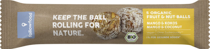 Die followfood Bio Fruit & Nut Balls stecken voller Energie: Datteln, Mangostücke und Kokosflocken werden in einer Kugel vereint – für einen rundes Geschmackserlebnis ganz ohne Zuckerzusatz. Dabei sind alle Zutaten rein pflanzlich und stammen aus ökologischem Anbau. Der ideale nachhaltige Snack für unterwegs und zwischendurch.
