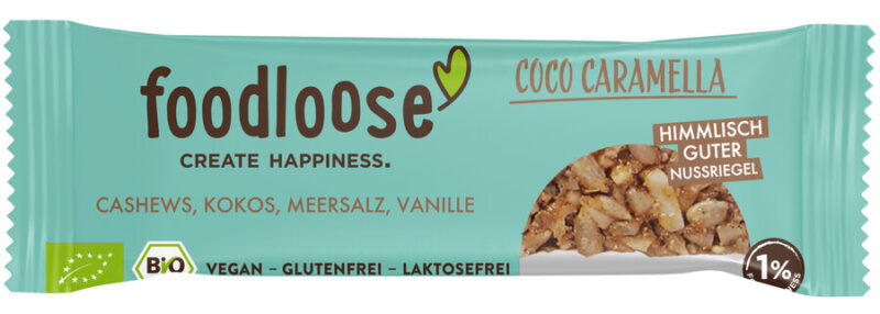 Der Coco Caramella Riegel von foodloose schmeckt wie Urlaub in der Karibik mit sonnigen Sandstränden und einer erfrischenden Brise in der Luft. Er besteht aus Sonnenblumenkernen, knackigen Cashewkernen, Kokoschips, Kardamom, Vanille und etwas Meersalz. Diese Zutaten werden mit Agavendicksaft und Kokosblütenzucker vermischt, flach ausgerollt und nach dem Aushärten in Riegelform geschnitten. Alle Rohstoffe werden sorgfältig ausgewählt und sind zu 100% bio. foodloose Nussriegel bestehen grundsätzlich immer nur aus knackigen Nüssen, Saaten, süßen Trockenfrüchten und spannenden Gewürzen. Alle Riegel sind vegan, laktosefrei und glutenfrei. foodloose Bio-Riegel sind nicht mit herkömmlichen Müsliriegeln zu vergleichen: auf Aromen, jegliche Art von Zusatzstoffen und Füllstoffe wird verzichtet. Für die beiden Gründerinnen Katharina und Verena steht die Qualität an erster Stelle. Alle Rezepturen sind inspiriert von schönen Reiseerlebnissen oder Erinnerungen des foodloose-Teams.