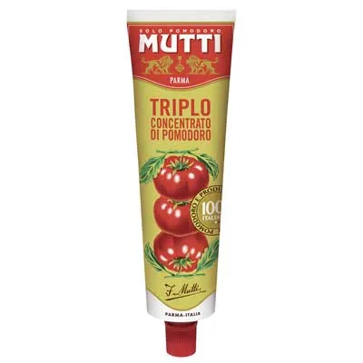 In 1 kg Tomatenmark werden 7 kg frische Tomaten verarbeitet. Mutti, Triplo Concentrato di Pomodoro, Tomatenmark, intensiv und sämig ist ideal für Rezepte mit langer Kochzeit wie Ragouts, oder bei kurzen Garzeiten für Saucen. Triplo Concentrato di Pomodoro, Tomatenmark, aus dem Hause Mutti erhalten Sie in einer 200 g Tube.